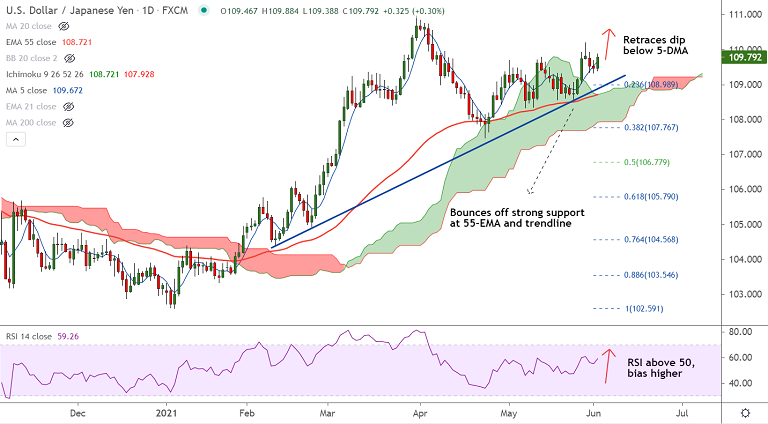 The major has edged higher after 2 straight days of weakness, retraced brief dip below 5-DMA, is set to resume upside.