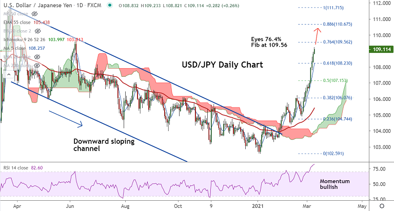 USD/JPY spirals higher for the 5th straight session, hits fresh 9-month high above 109 handle.