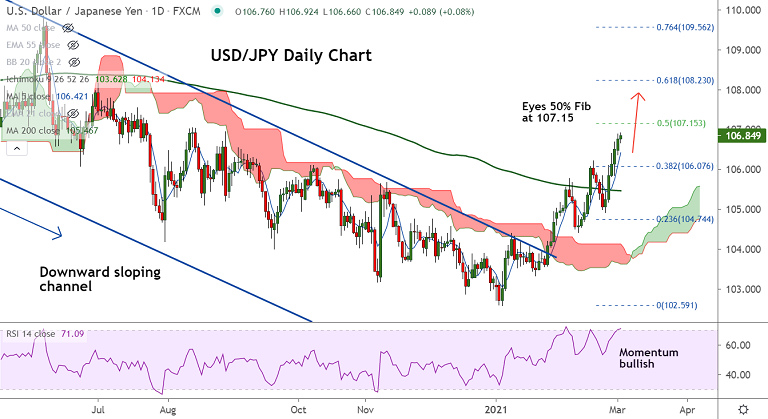 The pair has hit new 8-month highs at 106.92 and is on track to test 107.15 levels (nearly converged 110W EMA and 50% Fib retracement).