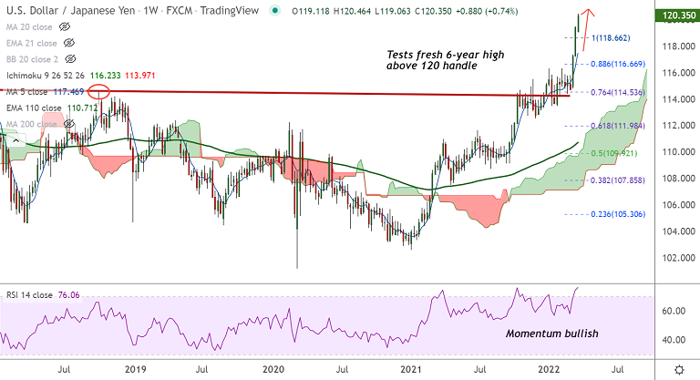 USD/JPY was trading 0.75% higher on the day at 120.36 at around 05:00 GMT, outlook is bullish.