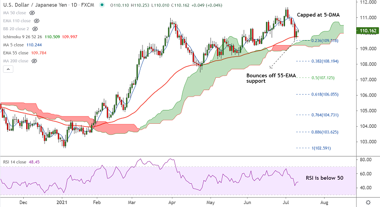 Break above 5-DMA will see more gains. Next hurdle for bulls lies at 20-DMA at 110.57. On the flipside, weakness only below 55-EMA.