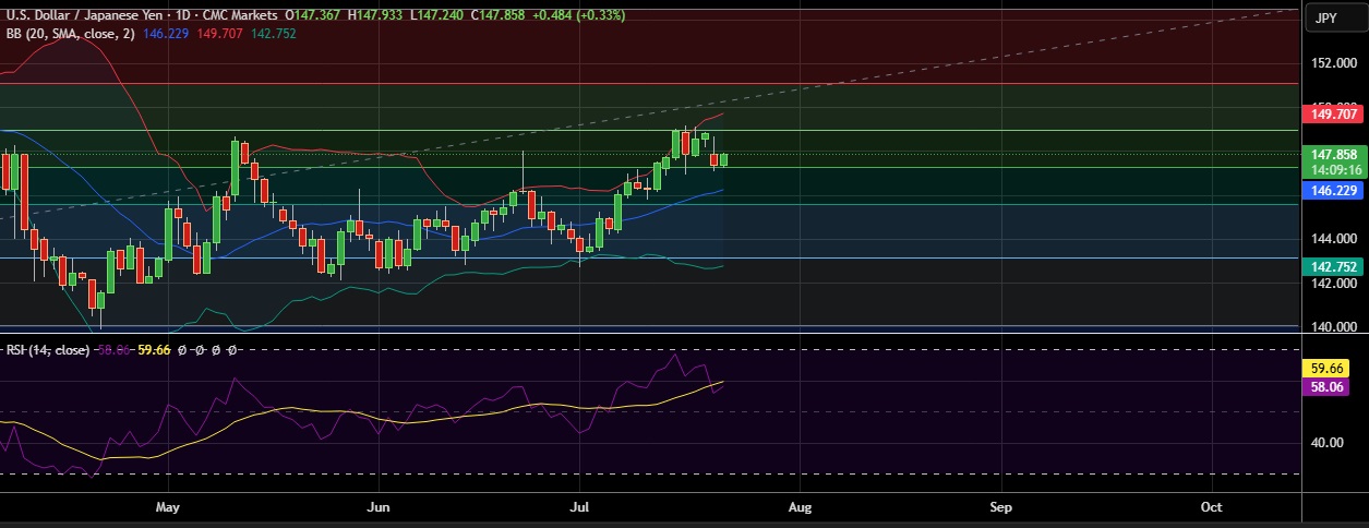 • Support is seen at 147.32(50%fib) and break below could take the pair towards 146.32 (SMA 20).