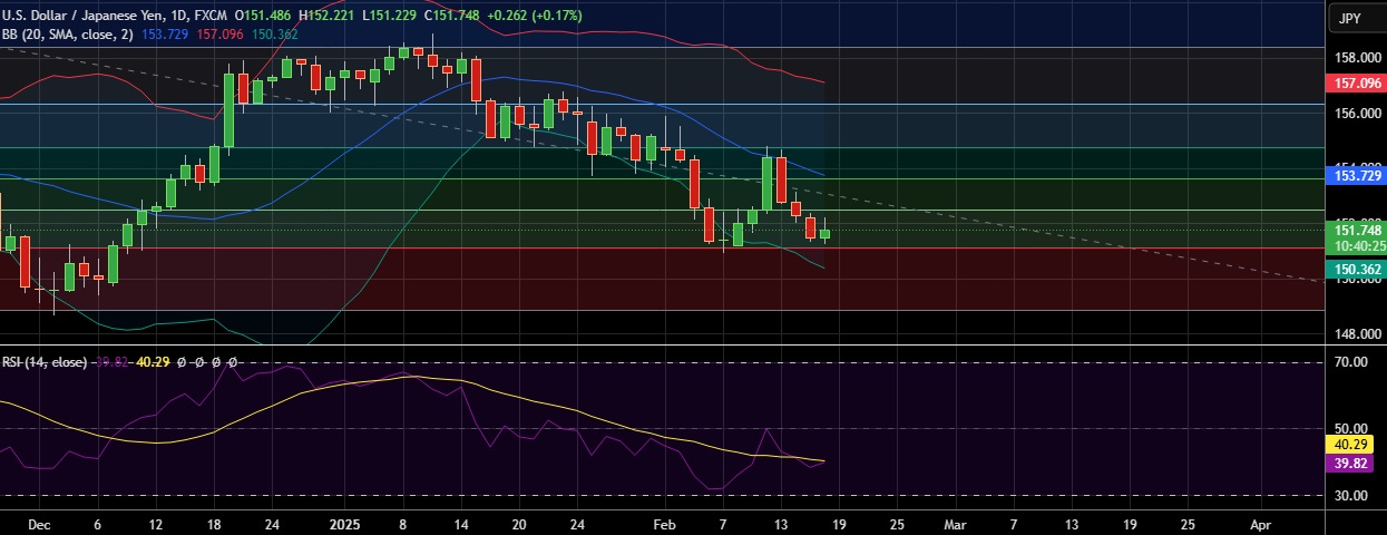 • Support is seen at 151.11 (23.6%fib) and break below could take the pair towards 150.30 (Lower BB).