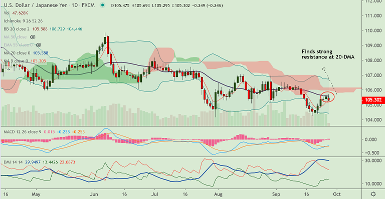 The pair is currently testing support at 5-DMA at 105.30 after upside was capped at 20-DMA resistance.