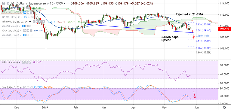 USD/JPY capped at 5-DMA, retreats from session highs at 109.62 to currently trade at 109.47 at 03:50 GMT.