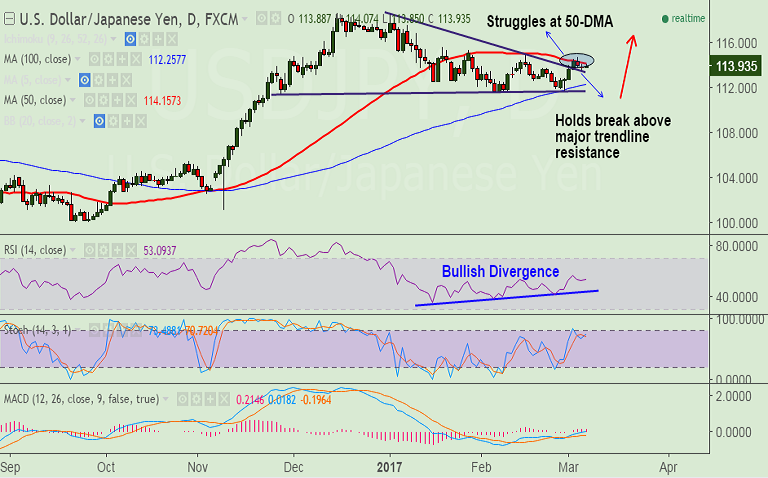 Resistance levels - 114.15 (50-DMA), 114.95 (Feb 15 high), 115.62 (Jan 19 high)