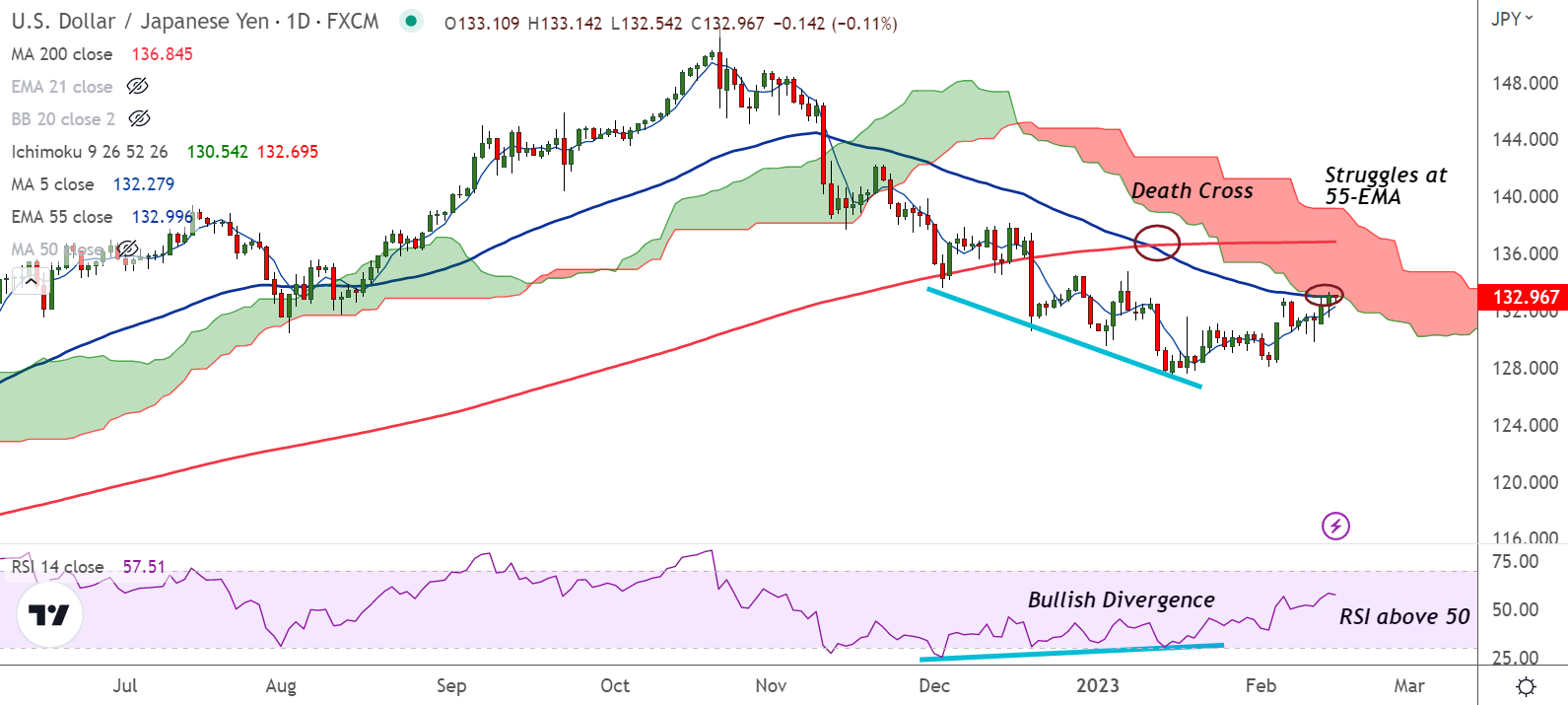 - The pair is struggling to get past 55-EMA and daily cloud resistance