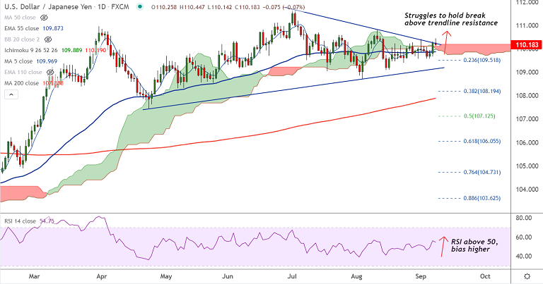 Support levels - 110.25 (Trendline support), 110.01 (5-DMA), 109.40 (110-EMA)