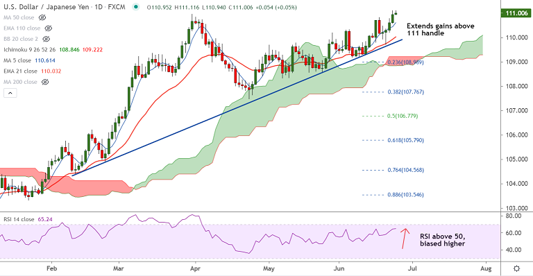 USD/JPY was trading 0.05% higher on the day at 111.00 at around 04:10 GMT, outlook bullish.