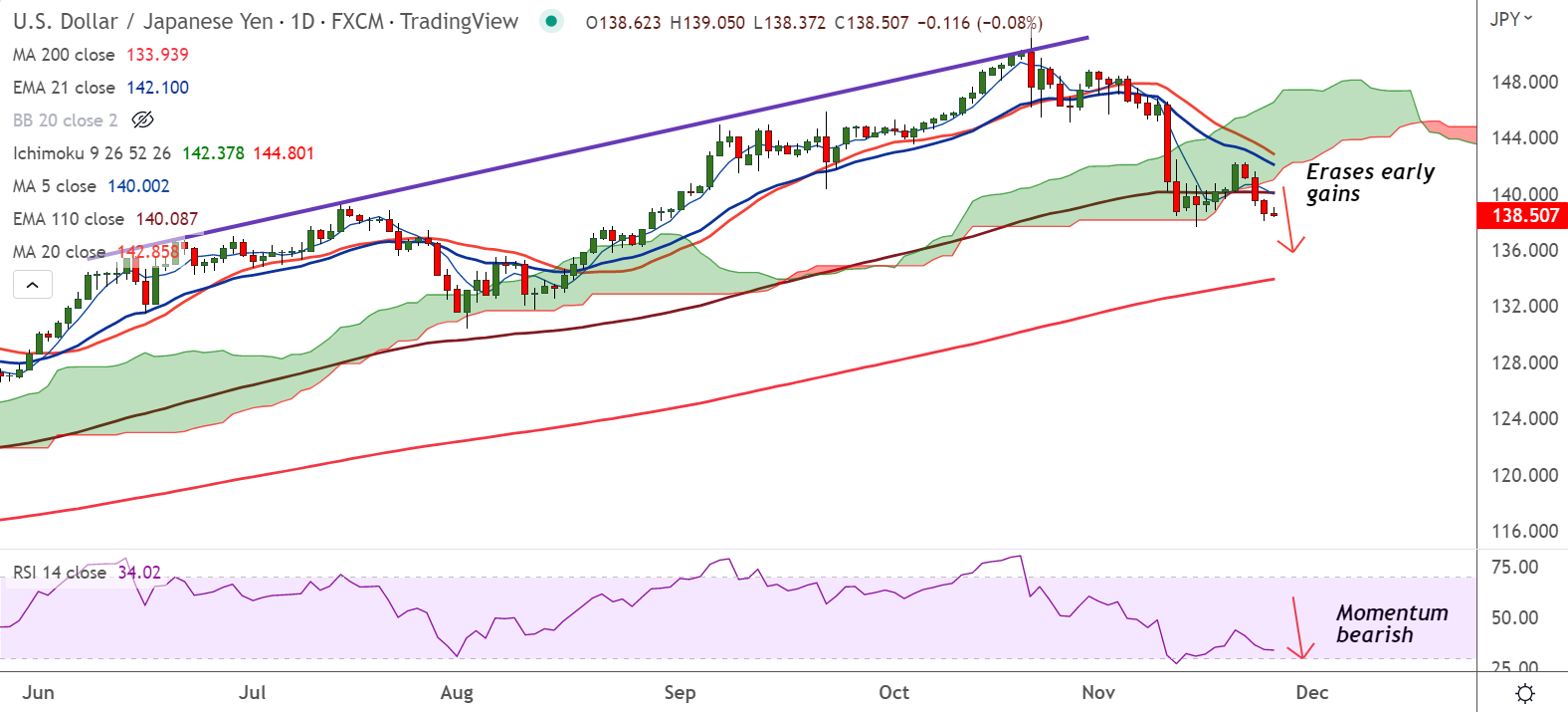 USD/JPY was trading 0.08% lower on the day at 138.51 at around 04:40 GMT. The pair is grinding lower for the fourth consecutive session, outlook is bearish.