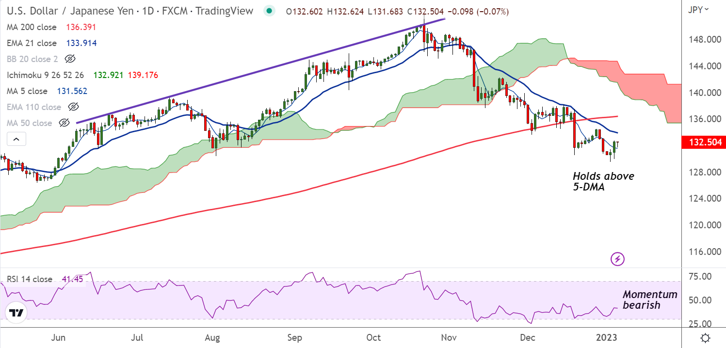 USD/JPY has bounced higher from multi-month lows at 129.50, holds above 5-DMA support. Price action hovers around 200H MA.