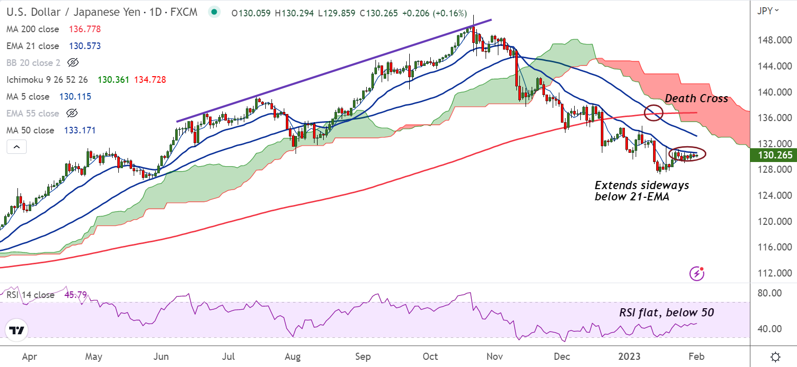 Summary: USD/JPY trades directionless below 21-EMA. Death Cross (bearish 50-DMA crossover on 200-DMA) keeps bearish bias.