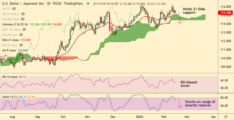 Support - 115.07 (21-EMA), Resistance - 115.54 (5-DMA)