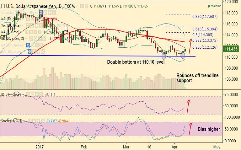 Support levels - 110.92 (5-DMA), 110.10 (trendline), 109.37 (50% Fib retrace of 100.08 to 118.66 rally)