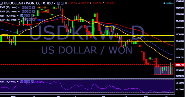 We prefer to take long position in USD/KRW only above 1,107 with stop loss at 1,092 and target of 1,142.