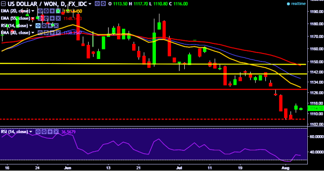 We prefer to take long position in USD/KRW only above 1,117 with stop loss at 1,105 and target 1,142.