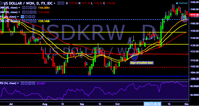 We prefer to take long position in USD/KRW around 1,168, stop loss at 1,160 and target of 1,182/1,196.