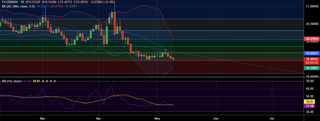 • Support is seen at 19.457(23.6%fib) and break below could take the pair towards 19.277(Lower BB).