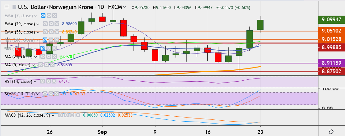 - Immediate resistance is located at 9.1304 (August 30 High) and close above could take it till 9.1648 (September 3 High).