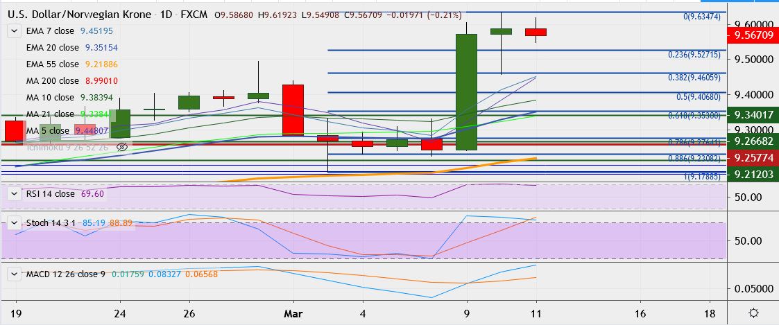 - On the downside, support is around 9.5271 (23.6% retracement of 9.1788 and 9.6349), break below could take it till 9.4605 (38.2% retracement)