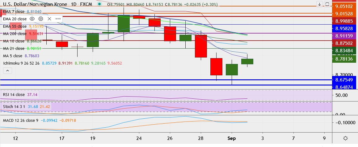 - USD/NOK trades 0.3 percent higher at 8.7859, having touched a low of 8.6506 on Tuesday, its lowest since July 2019.