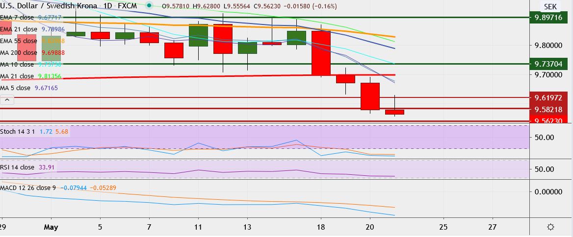 - USD/SEK trades 0.2 percent down at 9.5650, having hit a low of 9.5556 earlier, its lowest since March 12.