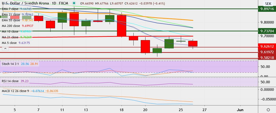 - Immediate resistance is located at 9.6995 (200-DMA), any close above could take it near 9.7142.