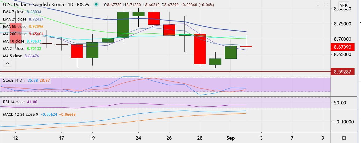 FxWirePro: USD/SEK struggles to sustains gains above 8.7000, strong resistance at 21-EMA