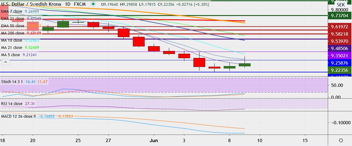 - USD/SEK trades 0.4 percent up at 9.2289, having hit a low of 9.1296 on Friday, its lowest since March 2019.