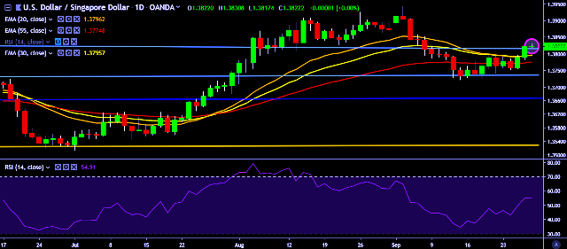 We prefer to take long position on USD/SGD around 1.3820, stop loss at 1.3790 and target of 1.3857/1.3913.