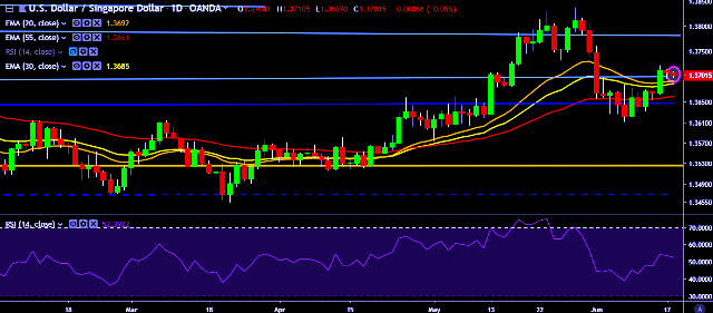- USD/SGD is currently trading around 1.3701 marks.