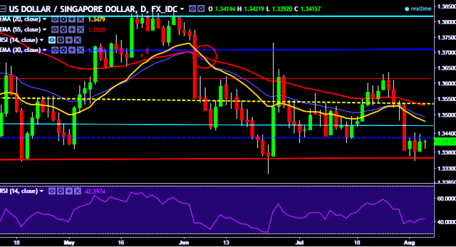 We prefer to take short position in USD/SGD around 1.3420 with stop loss at 1.3452 and target of 1.3353/1.3313.