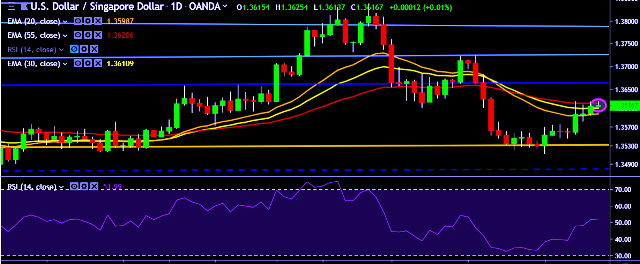 We prefer to take long position on USD/SGD only above 1.3633, stop loss at 1.3590 and target of 1.3680.