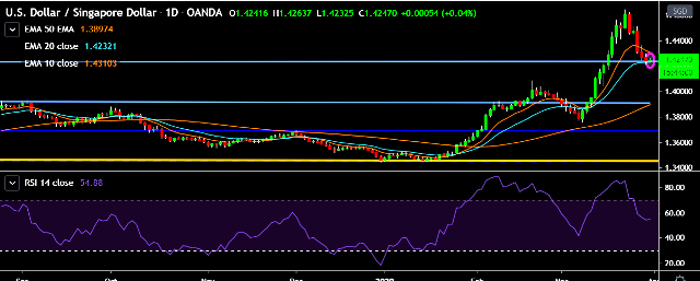 - USD/SGD is currently trading around 1.4245 marks.