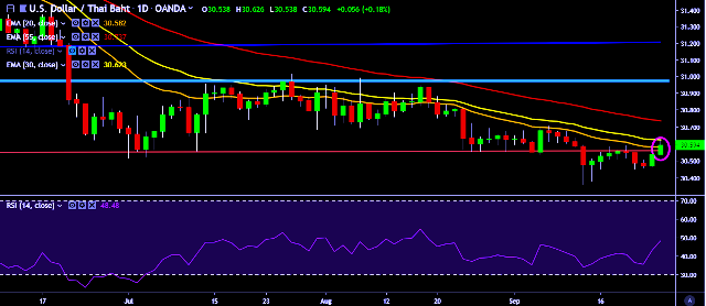 We prefer to go long on USD/THB around 30.55, stop loss at 30.40 and target of 30.70/30.97.