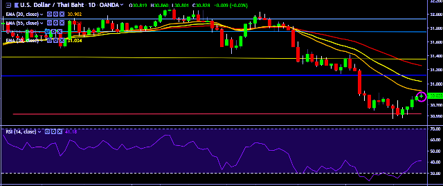 We prefer to take long position on USD/THB around 30.80, stop loss at 30.70 and target of 30.90/31.08.