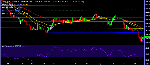 We prefer to take long position on USD/THB only above 30.90, stop loss at 30.70 and target of 31.20.