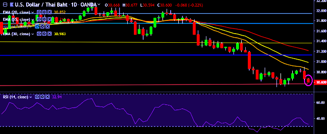 We prefer to take short position on USD/THB around 30.62, stop loss at 30.80 and target of 30.42/30.28.