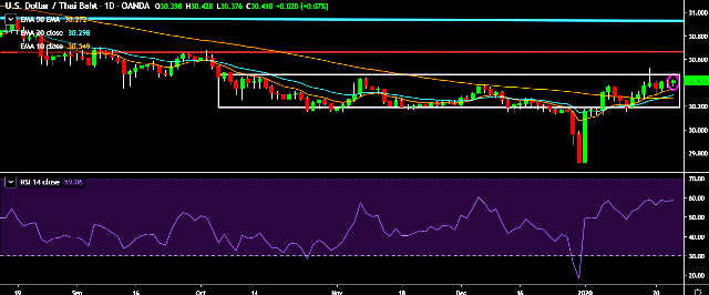 We prefer to go long on USD/THB only above 30.42, stop loss at 30.30 and target of 30.72.