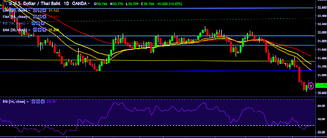 - USD/THB is currently trading around 30.76 marks.