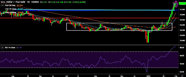 We prefer to go long on USD/THB around 31.20, stop loss at 31.09 and target of 31.50/31.70