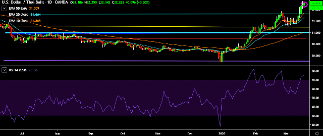 We prefer to go long on USD/THB around 32.20, stop loss at 31.85 and target of 32.48/32.76.