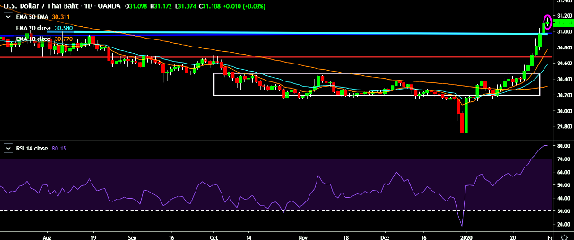 - USD/THB is currently trading around 31.11 marks.