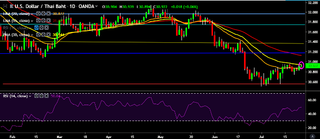 We prefer to take long position on USD/THB only above 30.95, stop loss at 30.80 and target of 31.20/31.50.