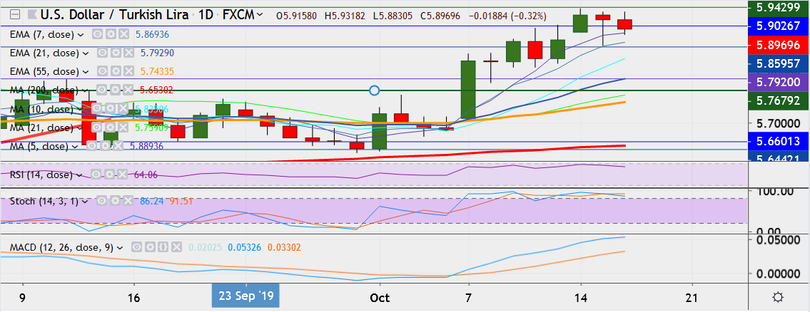 - USD/TRY is currently trading 0.4 percent down at 5.8944, having hit a high of 5.9384 on Monday, its highest since August 26.