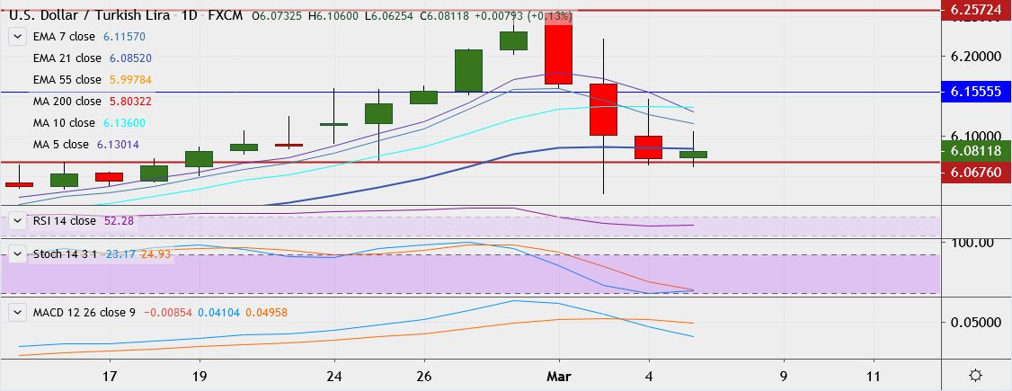- USD/TRY is trading down at 6.0730, having hit a high of 6.2569 on Monday, its highest since September 2018.