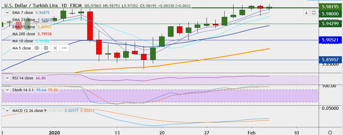 - On the downside, support is seen at 5.9720 (5-DMA) and break below could take it near 5.9643 (7-EMA).