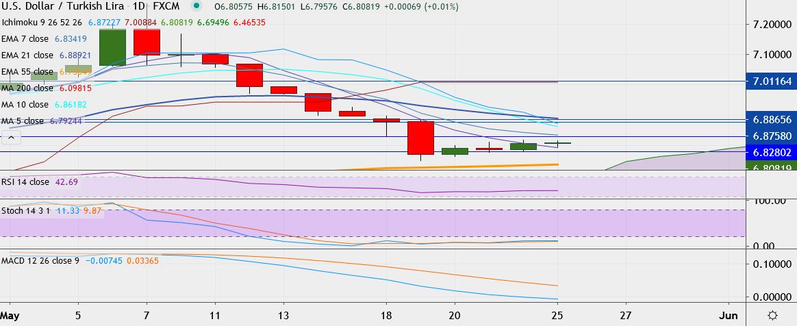 - USD/TRY is trading flat at 6.8078, having hit a low of 6.7493 on Tuesday, its lowest since April 13.