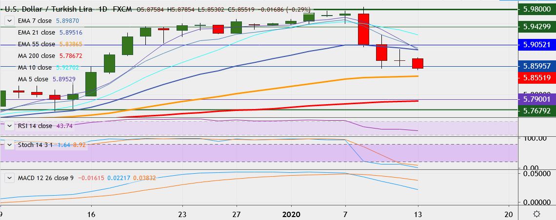 - On the downside, support is seen at 5.8380 (55-EMA) and break below could take it near 5.8230.