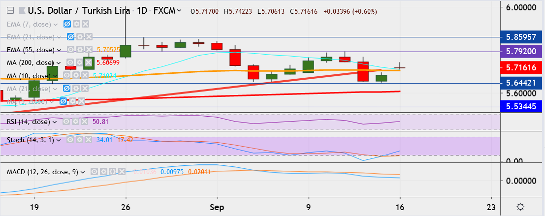- USD/TRY is currently trading 0.7 percent up at 5.7422, having hit a low of 5.6468 on Friday, its lowest since August 20.